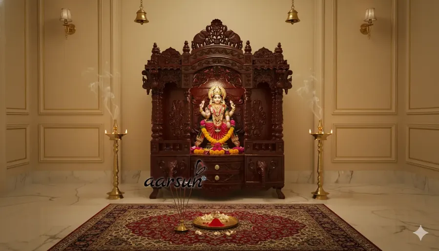. Includes Bhog/Diya tray on base, two cabinets, and ample storage for pooja essentials.