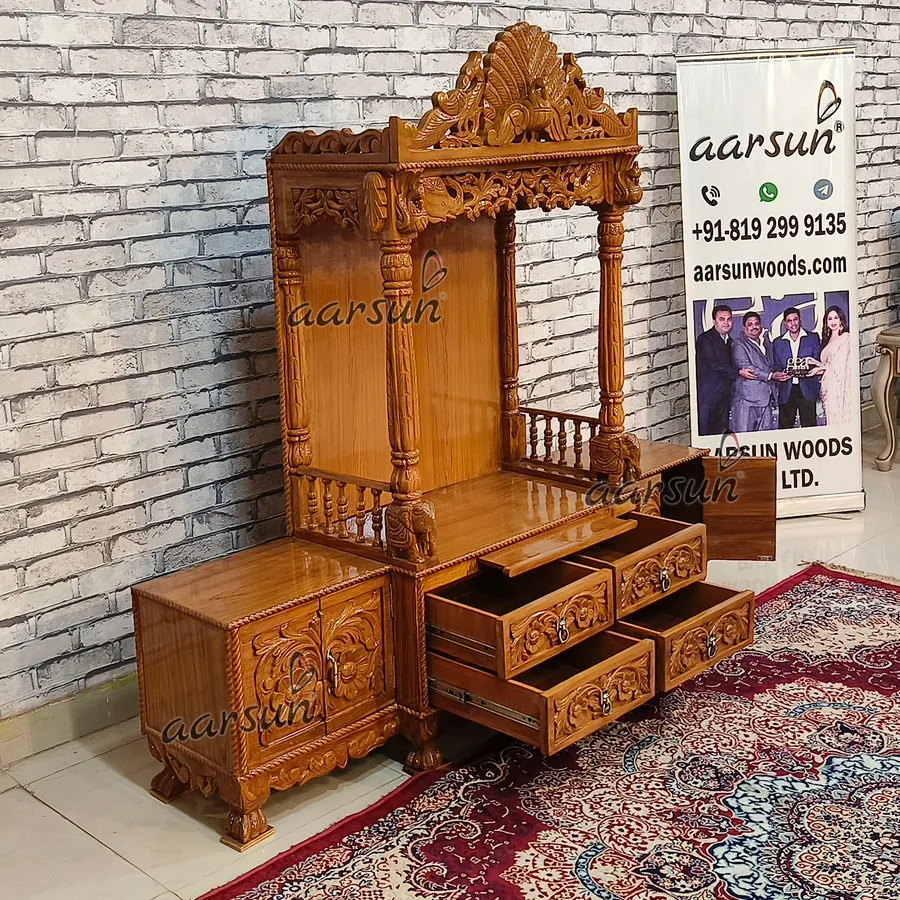Divine Mandir – Where Divinity Resides is a beautifully handcrafted teak wood temple designed to create a serene and sacred space in your home, featuring a rich walnut gloss finish and vastu-friendly proportions. This wooden home mandir includes a spacious prayer area along with four drawers and dual storage cabinets for organized pooja essentials. Its elegant craftsmanship blends traditional temple aesthetics with modern functionality, making it ideal for devotional spaces across Indian traditions. Watch the craftsmanship and detailing in our YouTube video.