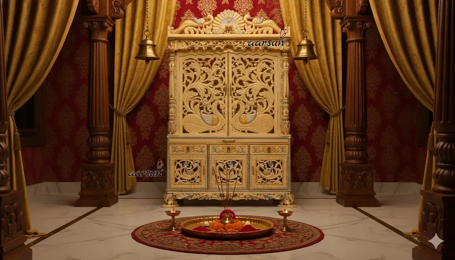 At Aarsun, we have a diverse collection of temple designs appreciated globally. This particular temple is made from solid teak wood and features exquisite peacock carvings, making it truly elegant.