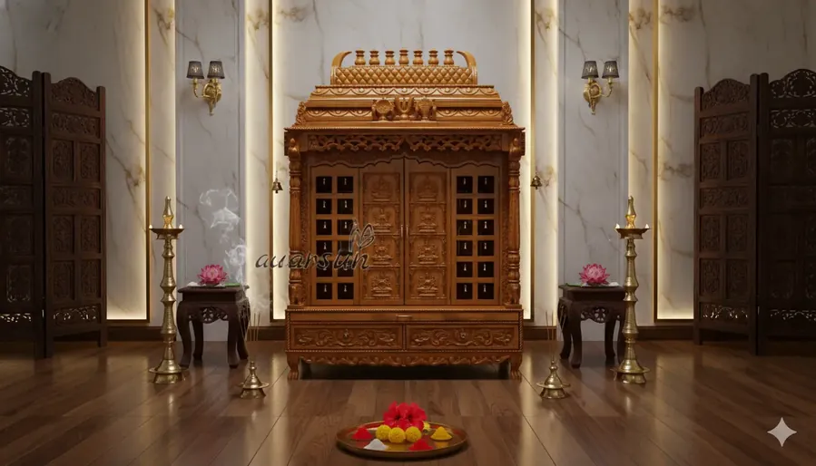 This Ashtalakshmi Mandir is meticulously handcrafted by skilled artisans from premium teak wood. It features detailed Swastik and Tamil OM carvings, combining spiritual significance with aesthetic beauty.