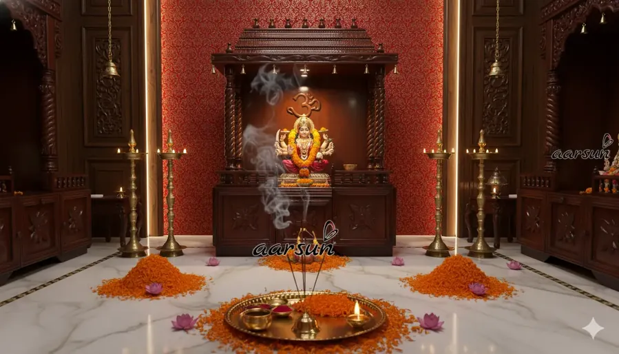 The temple is divided into three main parts: the Shikhar/Gopuram top, the central Garbhagriha, and the bottom storage section. The Shikhar features intricate South Indian-style carvings. The Garbhagriha contains stepped platforms for proper deity placement as per Vastu principles, ensuring all idols are visible and at ideal height. The bottom section has large storage with a Diya/Bhog tray and full-size cabinets with carved doors.