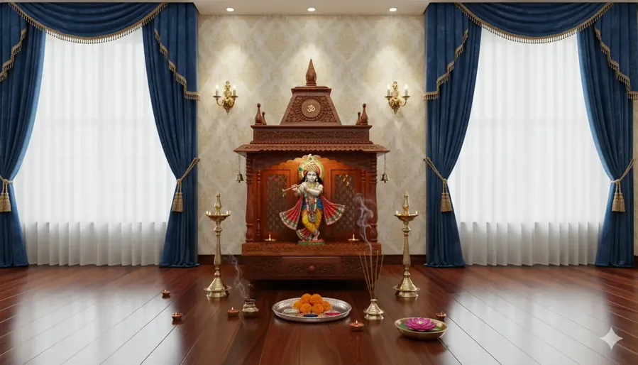 Pull-out style drawers with floral carvings and a slider tray for Diya provide functional storage for pooja essentials.
