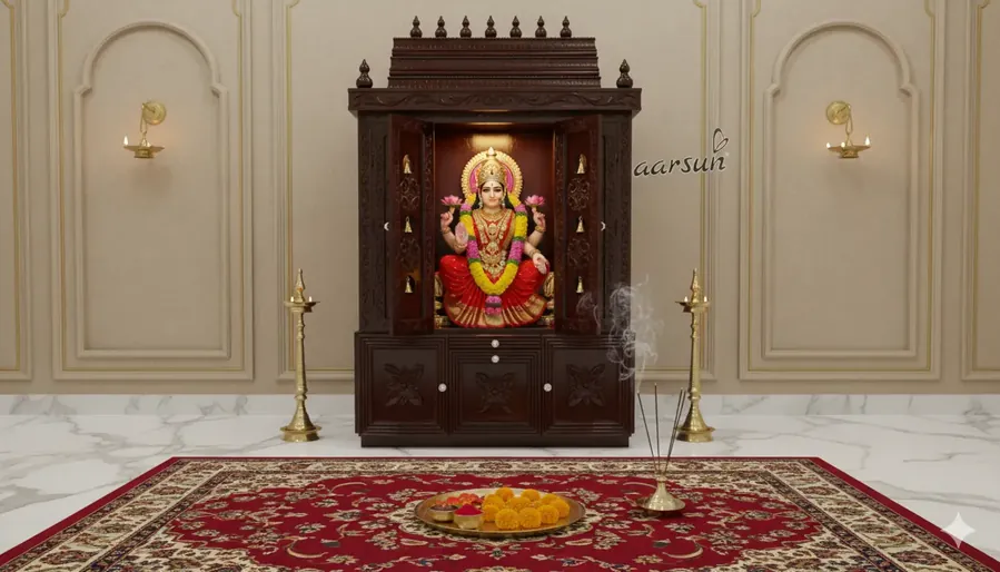 A Temple handcrafted Premium Quality Wooden Bell Mandir. This Mandir features a beautiful large Shikhar at the top, adding an enchanting element to the design. The closed Garbhagriha ensures privacy and sanctity during prayers. Additionally, the platform with a cabinet provides convenient storage for your religious artifacts, keeping everything you need within reach while praying. With these features, this Mandir offers a comprehensive and functional space for your devotional practices.