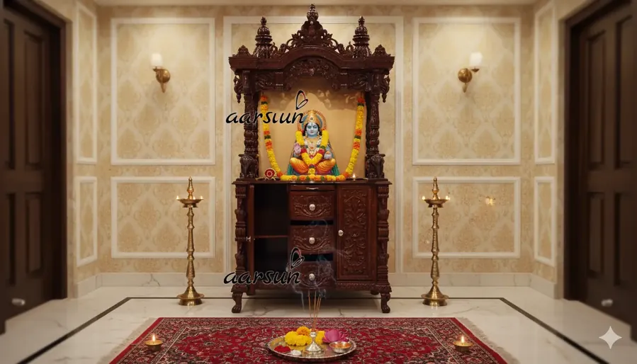This handcrafted Teak Wood Walnut Finish Temple YT-391 is designed to bring elegance and traditional charm to your home pooja space. The temple features three domes with the center dome larger, beautifully carved peacocks, floral patterns, and elephants at the base of pillars. It comes with 2 full-size cabinets, 3 pull-out drawers, and a slider tray for diya or dhoop, offering ample storage while maintaining aesthetic appeal. Made from premium teak wood with a walnut finish (customizable to natural, white, gold, or mixed finishes), this temple is durable, termite-resistant, and designed to last decades. Dimensions: 42" L x 24" D x 84" H. Watch detailed Mandir videos in our Wooden Temple Collection .