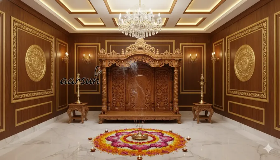 This top designer wooden temple (YT816) is part of Aarsun's exclusive collection of home mandirs. Every temple is handcrafted with attention to traditional details, ensuring both elegance and functionality for daily pooja rituals.