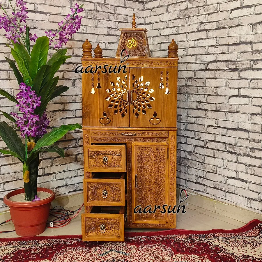 This Unique Peacock Feather Panel Design Wooden Temple with LED is an exquisitely handcrafted mandir made from premium teak wood. The intricate peacock feather panels, combined with subtle LED lighting, create a serene and divine ambiance for your pooja space. The mandir features a spacious Garbhagriha, a platform for idols, and a compact yet elegant design that fits perfectly in homes of any size. Each unit is handcrafted by skilled artisans, ensuring unmatched quality and uniqueness. Watch a detailed video of this mandir here: Click Here.