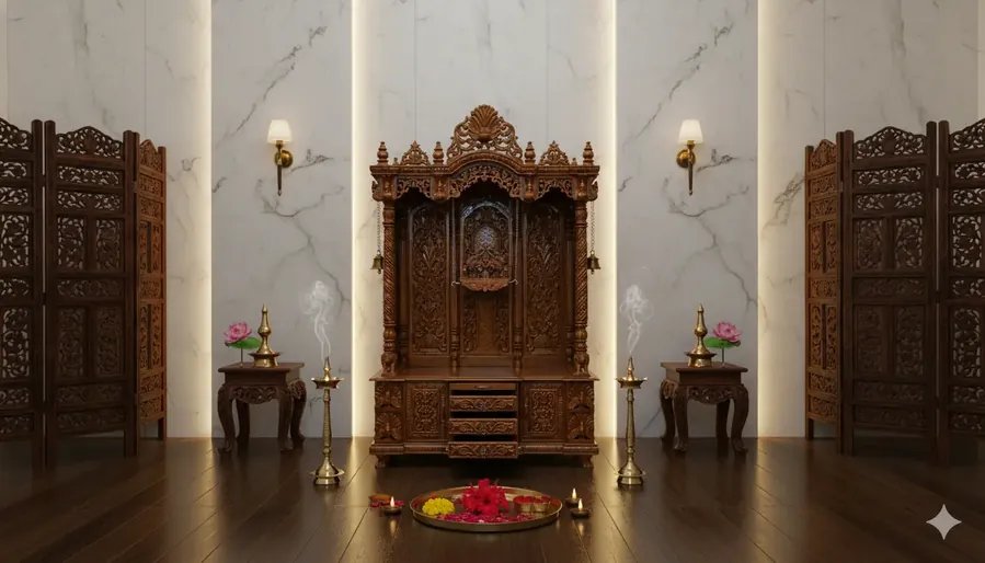 This Wooden Ganesh ji Temple Design is beautifully handcrafted from premium teak wood, featuring LED lighting and the sacred Gayatri Mantra. The temple includes a spacious cabinet with three drawers, providing ample storage for pooja essentials. The intricate carvings, combined with a high-gloss finish, make this temple both a functional and artistic centerpiece for your home. Fully hand-carved by skilled artisans, each unit is unique and can be customized to your requirements. Watch the detailed video of this temple here: Click Here.