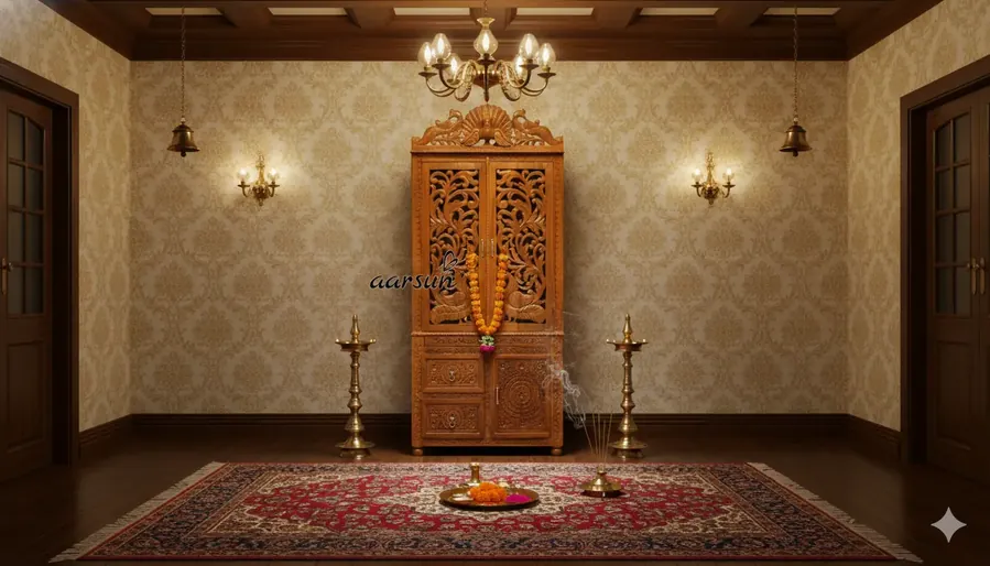 The Wooden Temple For Your Home is an exquisite piece handcrafted from solid teak wood, showcasing detailed peacock carvings that enhance its royal and elegant appeal. This temple comes with functional drawers and a Bhoj tray, making it convenient to store pooja essentials while keeping the space organized.