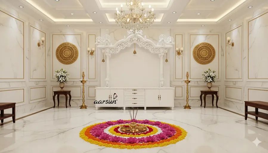 Aarsun wooden white temple in teak wood, finished in satin white paint with a marble look. The temple looks just like a marble temple and is just as beautiful and elegant. The top of the temple features a carved garland and peacocks. The sides are adorned with pillars, beneath which elephants stand gracefully with downward trunks, in a walking form. The unit offers ample storage space with four pull-out drawers in the center and two side cabinets. The unit has been designed according to the client's requirements. The buyer shared images of a marble temple, and our skilled artisans replicated it in wood. We have a variety of temple designs available, please take a look at the temple category. We provide delivery within India and worldwide