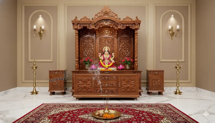 The Pooja Mandap Top Design for Home – 666 is a grand traditional home temple handcrafted from premium quality teak wood, featuring a gopuram-style shikhar with gold highlights, Om detailing, and elegant hanging bells on folding doors. Designed for spacious home mandirs, this pooja mandap includes a large garbhagriha, a smooth pull-out bhog and diya tray, and three beautifully carved storage cabinets that combine devotion with functionality. Built using indigenous woodworking techniques, this mandir ensures durability, vastu harmony, and timeless craftsmanship while offering complete customization in size and finish. Explore installation videos and design walkthroughs on our YouTube channel.