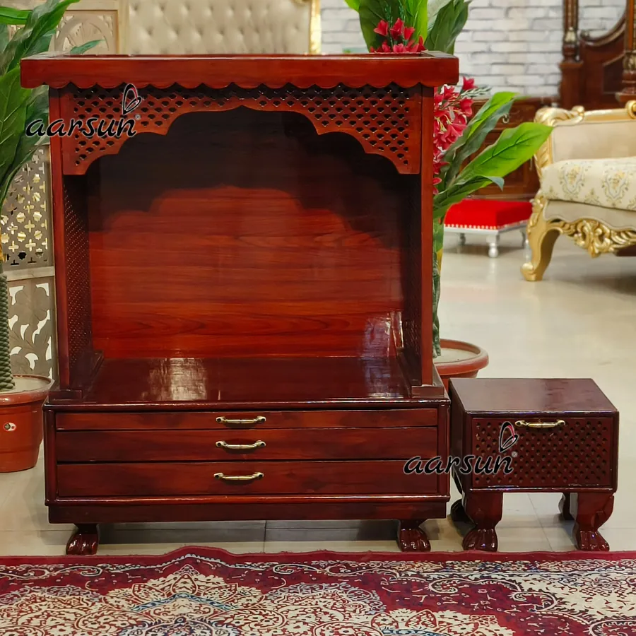 This modern temple is crafted from premium solid teak wood, featuring CNC-precision designs along with handcrafted detailing for a luxurious look. LED lighting enhances the spiritual ambiance.