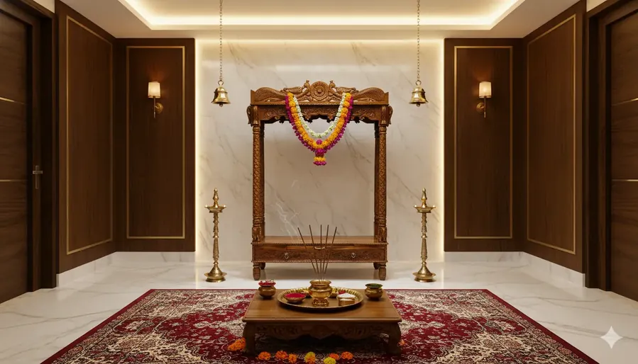 This open-style temple with 4 carved pillars offers a traditional yet elegant design for your pooja space.